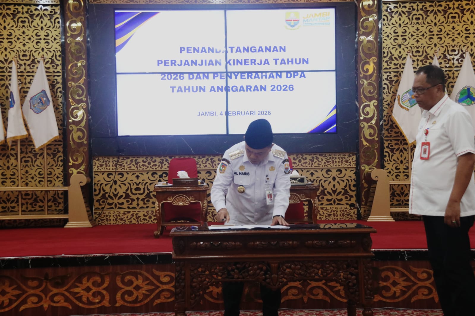 DJAMBI.ID, Jambi – Gubernur Jambi Dr. H. Al Haris, S.Sos., MH menegaskan pentingnya komitmen kerja yang terukur, fokus, dan dapat dipertanggungjawabkan dalam penyelenggaraan pemerintahan melalui Penandatanganan Perjanjian Kinerja Tahun 2026 yang dirangkaikan dengan Penyerahan Dokumen Pelaksanaan Anggaran (DPA) Tahun Anggaran 2026, bertempat di Ruang Pola Kantor Gubernur Jambi, Senin (04/02/2026) siang.