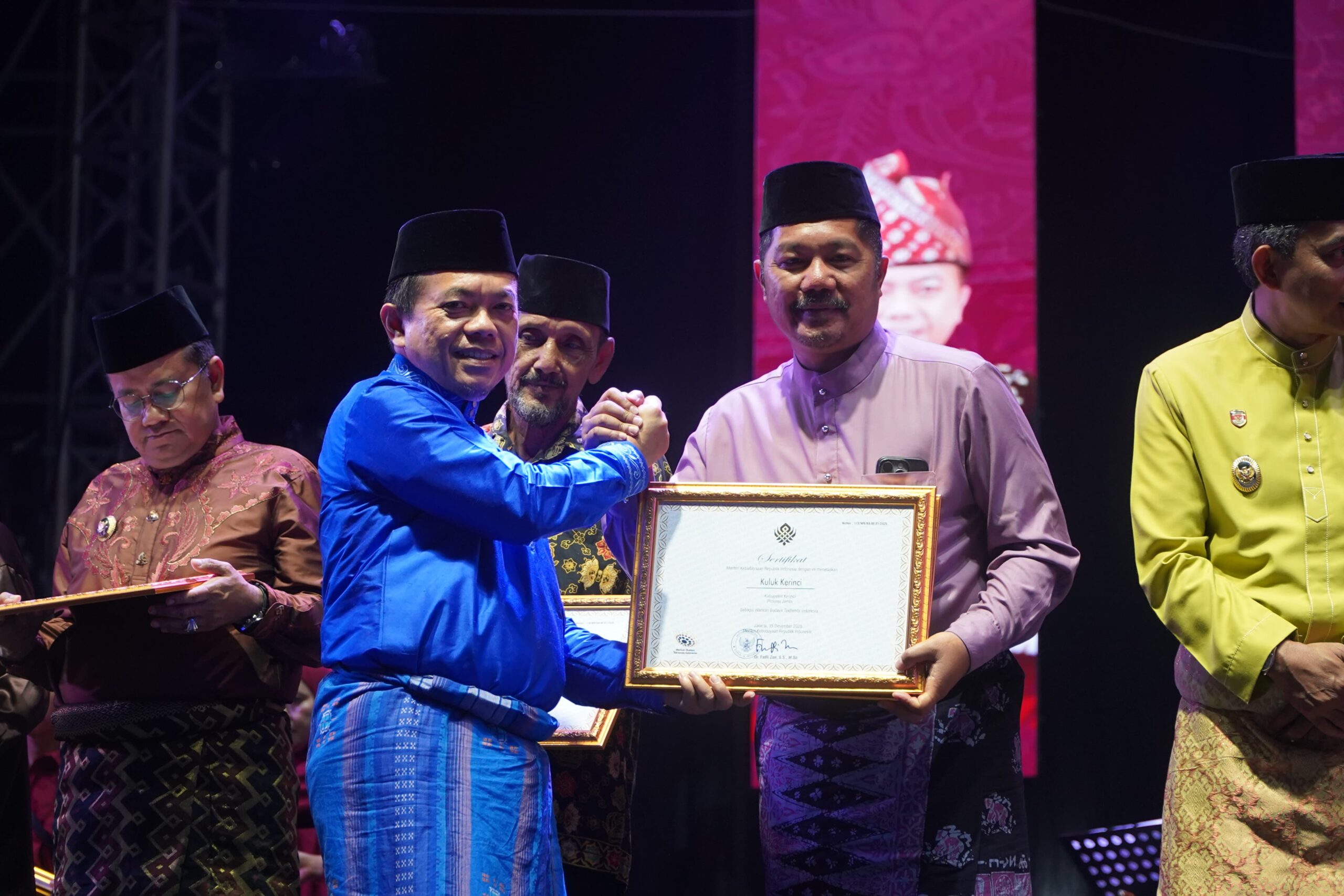Pada kesempatan tersebut, Bupati Monadi menerima Sertifikat Warisan Budaya Takbenda Indonesia untuk Kuluk Kerinci, yang telah ditetapkan oleh Menteri Kebudayaan Republik Indonesia. Sertifikat ini diserahkan secara simbolis oleh Gubernur Jambi, Dr. H. Al Haris, S.Sos., M.H, sebagai bentuk pengakuan negara atas nilai sejarah, filosofi, serta identitas budaya yang melekat pada Kuluk Kerinci sebagai warisan budaya masyarakat Kerinci.