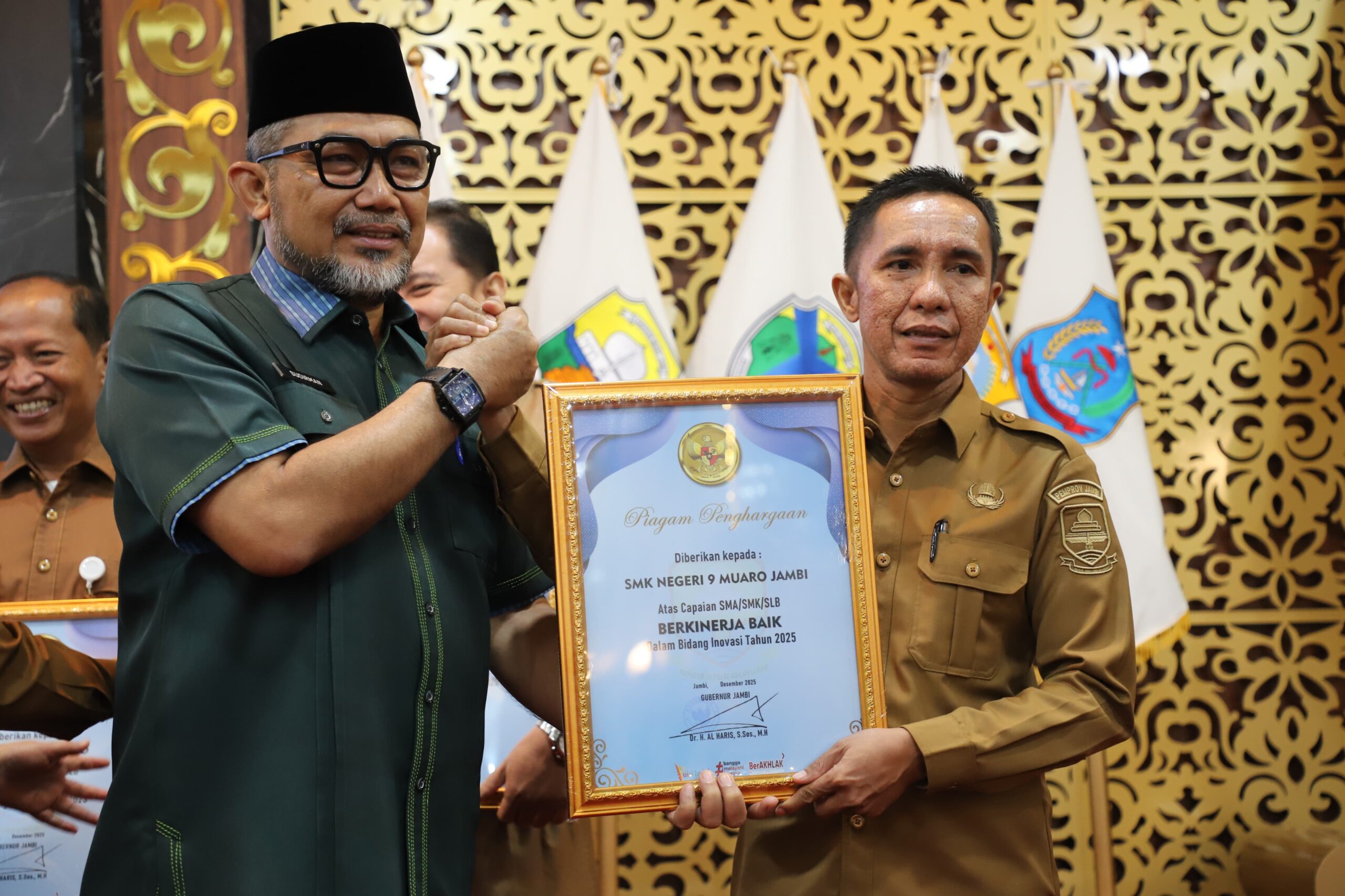 Piagam penghargaan tersebut ditandatangani langsung oleh Gubernur Jambi Dr. H. Al Haris, S.Sos., M.H., dan diserahkan oleh Sekretaris Daerah Provinsi Jambi Dr. H. Sudirman, S.H., M.H. pada acara Penganugerahan Capaian Kinerja dalam Bidang Inovasi dan Pengelolaan Keuangan Daerah Provinsi Jambi Tahun 2025, bertempat di Ruang Pola Kantor Gubernur Jambi, Selasa (16/12/2025).